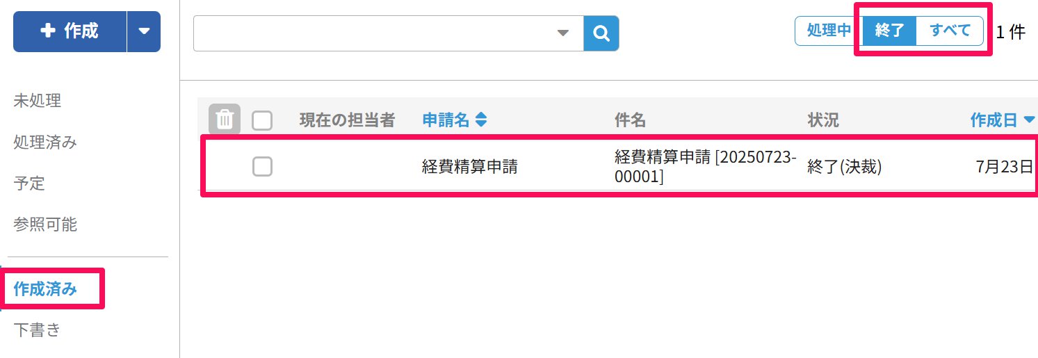 中止したタスクデータは一覧画面で「申請済み」をクリックし、「終了した申請データ」または「すべて」をクリックすることで確認できます。