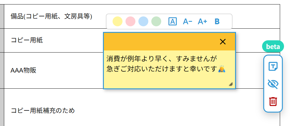 付箋上部に表示されるツールバーから、付箋のスタイルを編集可能です。