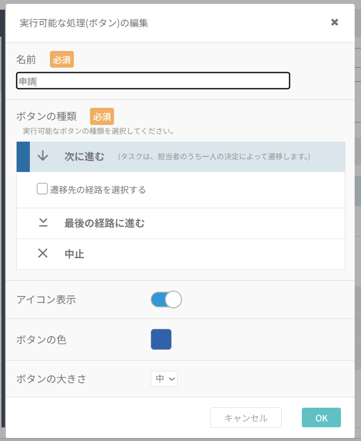それぞれの設定はモデル編集画面の「経路」>「実行可能な処理(ボタン)」の編集画面にて行います。設定画面