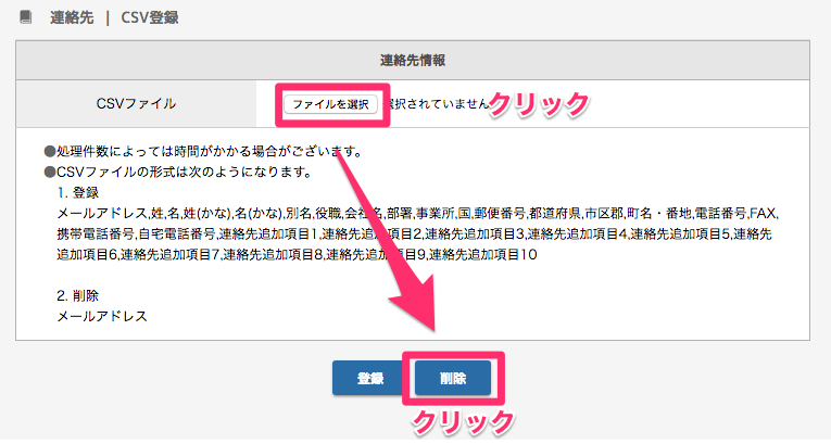 連絡先の一括作成と同様に、連絡先の削除も所定のフォーマットにしたがった CSV から一括して行うことが可能です。連絡先の一括削除を行うには「CSV登録」をクリックします。