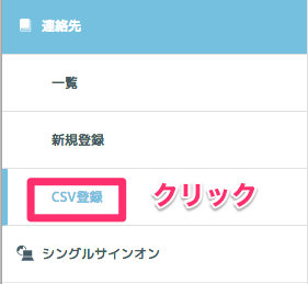 - 管理画面にて「連絡先」>「CSV登録」をクリックします。